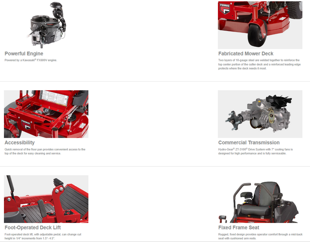 Durability, affordability and power are packed into the compact Ferris® F60 which is loaded with commercial features and premium components. Designed to get you in and out of your jobs quickly and confidently, the F60 features a commercial transmission, fabricated mower deck, fixed frame and reaches speeds of up to 7 mph.