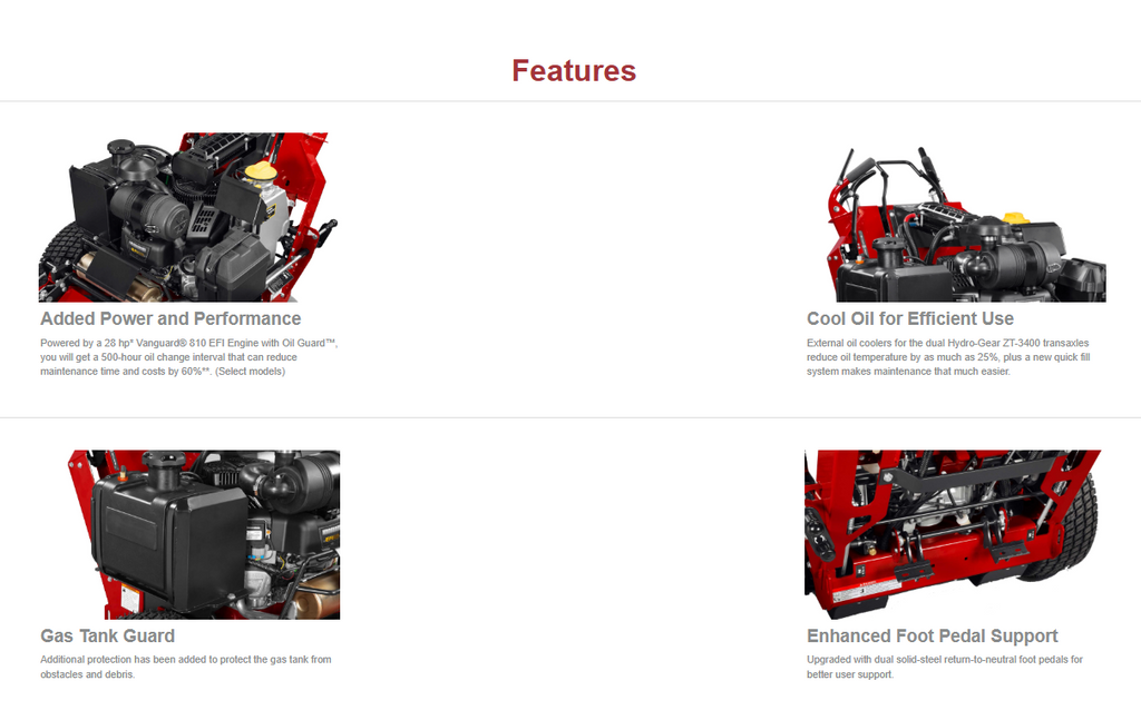 2-Year limited warranty commercial use, front-to-rear, parts & labor. Coverage on other components varies, please see operator's manual for complete details.