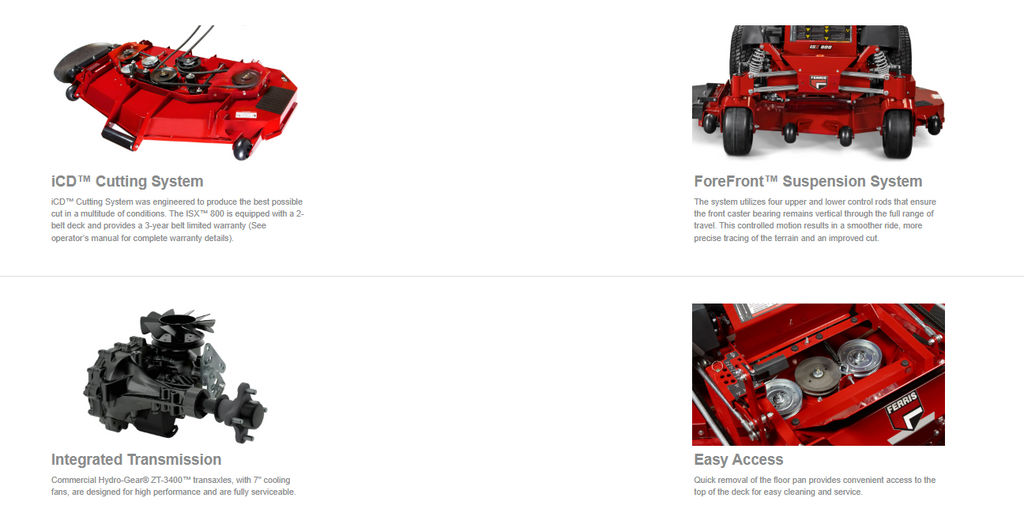 The ISX™ 800 is engineered to increase comfort and efficiency, including new OilXtend™ technology to boost productivity. We combine next-generation Ferris technology - ForeFront™ Suspension with iCD™ and iCD™+ Cutting Systems for a smoother ride and improved cut.
